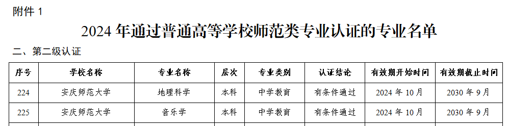 近日,教育部办公厅发布了2024年通过普通高等学校师范类专业认证及中期审核专业名单,金沙官网音乐学、地理科学2个专业顺利通过师范类专业二级认证,认证结论为有条件通过,有效期六年(2024年10月至2030年9月)。同时,英语和化学2个专业通过师范类专业认证中期审核,保持认证有效期到2027年8月。