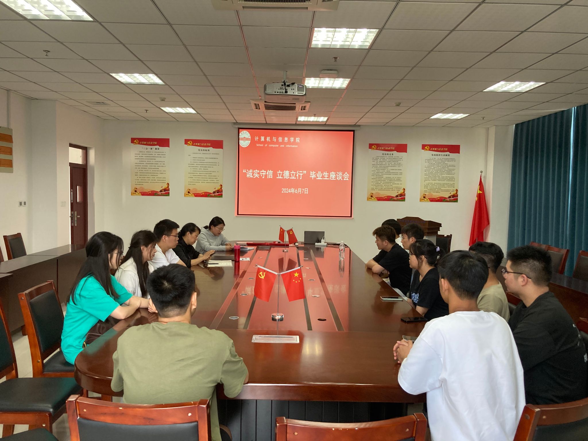 主题座谈强化诚信意识。6月7日下午,计算机与信息学院于L楼318会议室召开了家庭经济困难毕业生诚信教育座谈会。学院党委书记陈银凤与毕业生进行了深入交谈,她对毕业生顺利完成学业表达了诚挚的祝福,详细询问了毕业生们的毕业情况和下一步打算。陈银凤强调,诚信是个体立身处世的根本原则,是社会和睦和谐的基本前提,是国家兴旺发达的重要基石,倡导毕业生们要牢固树立诚信意识,避免因失信而导致个人信用降低造成不良后果。同时,她勉励毕业生们要常怀感恩之心,牢记党、国家与社会的关心关爱,感恩母校、老师、同学,厚植家国情怀、涵养品格,在新的征程上继续脚踏实地、奋发向上,为中国式现代化挺膺担当。