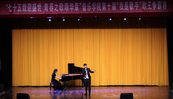 近日,音乐学院“七十五载迎盛世 青春之歌颂华章”第十届“我是歌手”歌王争霸赛决赛校音乐厅举行。音乐学院党委副书记肖之进、副院长彭传山及300余名观众到现场观摩。音乐学院副院长高艳,教师刘蕊、王鹏、张源宁、王晨宇担任评委,18个院系学生会成员担任赛事观众评委。
