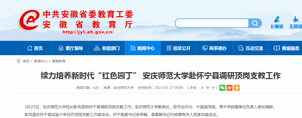 3月23日,金沙集团3354cc校长彭凤莲到怀宁县调研顶岗支教工作。金沙集团3354cc教务处、校市合作办、外国语学院、美术学院等单位负责人参加调研。