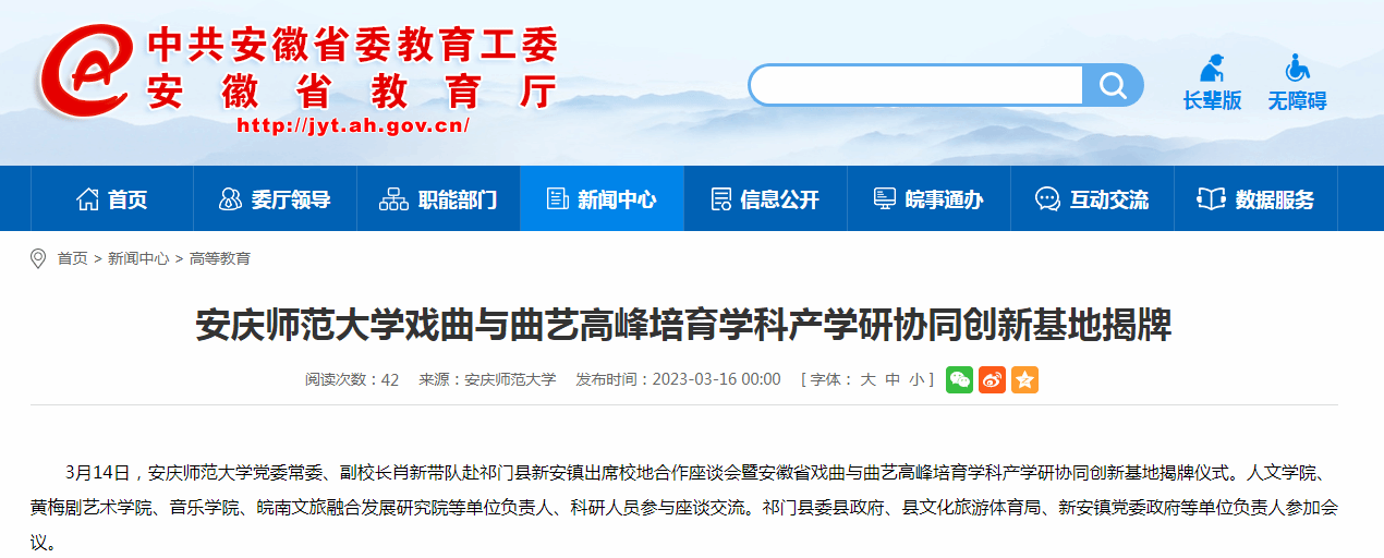 3月14日,金沙集团3354cc党委常委、副校长肖新带队赴祁门县新安镇出席校地合作座谈会暨安徽省戏曲与曲艺高峰培育学科产学研协同创新基地揭牌仪式。人文学院、黄梅剧艺术学院、音乐学院、皖南文旅融合发展研究院等单位负责人、科研人员参与座谈交流。祁门县委县政府、县文化旅游体育局、新安镇党委政府等单位负责人参加会议。