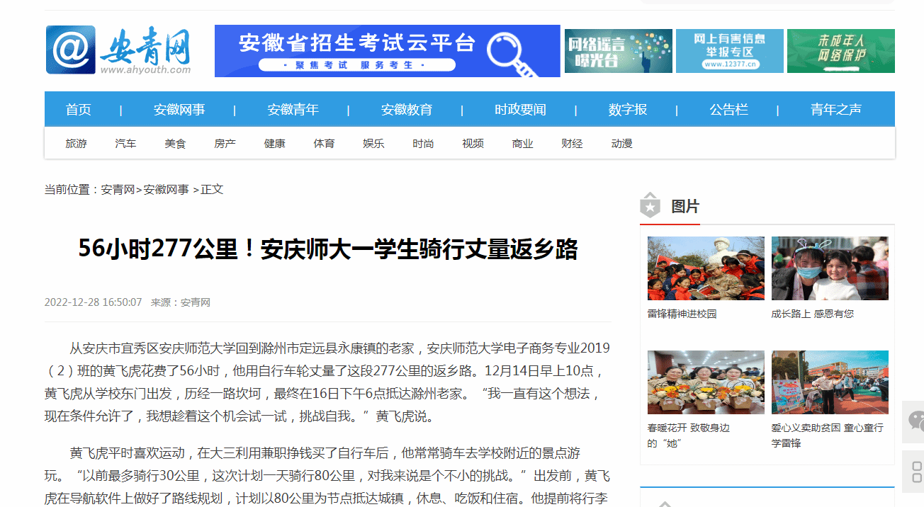 从安庆市宜秀区金沙集团3354cc回到滁州市定远县永康镇的老家,金沙集团3354cc电子商务专业2019(2)班的黄飞虎花费了56小时,他用自行车轮丈量了这段277公里的返乡路。12月14日早上10点,黄飞虎从学校东门出发,历经一路坎坷,最终在16日下午6点抵达滁州老家。“我一直有这个想法,现在条件允许了,我想趁着这个机会试一试,挑战自我。”黄飞虎说。