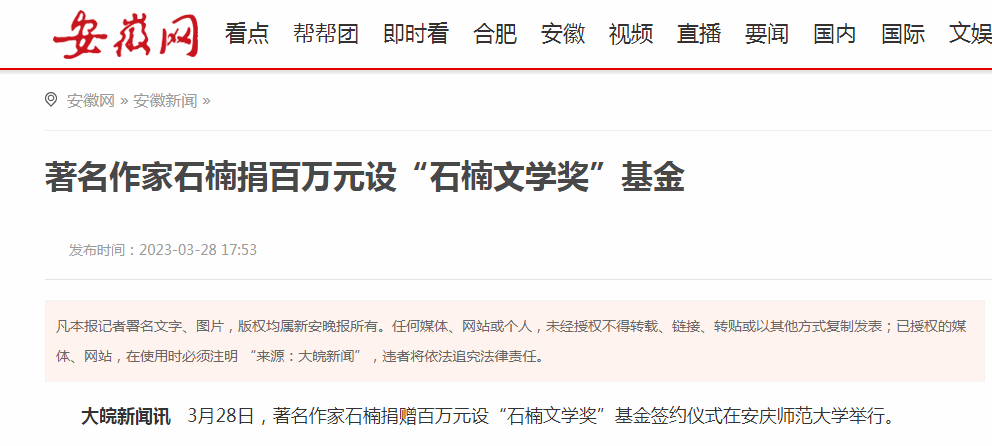 3月28日,著名作家石楠捐赠百万元设“石楠文学奖”基金签约仪式在金沙集团3354cc举行。