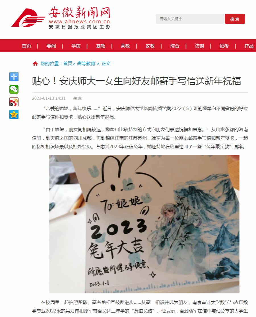 “由于放假,朋友间相隔较远,我想用比较特别的方式向朋友们表达祝福和思念。”从山水茶都的河南信阳,到天府之国的四川成都,再到锦绣江南的江苏苏州,滕军为每一位朋友邮寄手写信和新年贺卡,一起回忆初相识场景以及相处经历。考虑到2023年正值兔年,她还特地在信里绘制了一些“兔年限定款”图案。