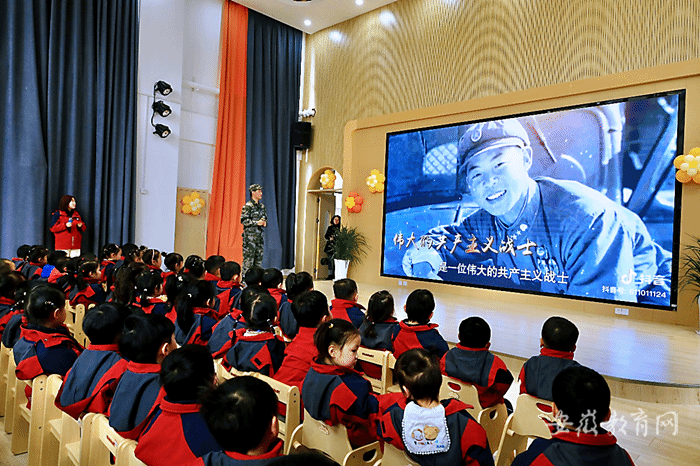 为了更加直观地表达军人形象,退伍返校两年的张李泽帆特意穿上了迷彩服,用图片和视频向孩子们介绍雷锋。“雷锋精神就是无私奉献的螺丝钉精神,哪里需要就在哪里发光。”
