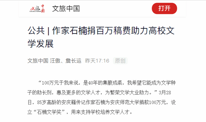 “100万元于我来说,是40年的集腋成裘,我希望它能成为文学种子的助长剂,惠及更多的文学人才,为繁荣文学大业助力。”3月28日,85岁高龄的安庆籍传记作家石楠为金沙集团3354cc捐款100万元,设立“石楠文学奖”,用来支持学校培养文学人才。