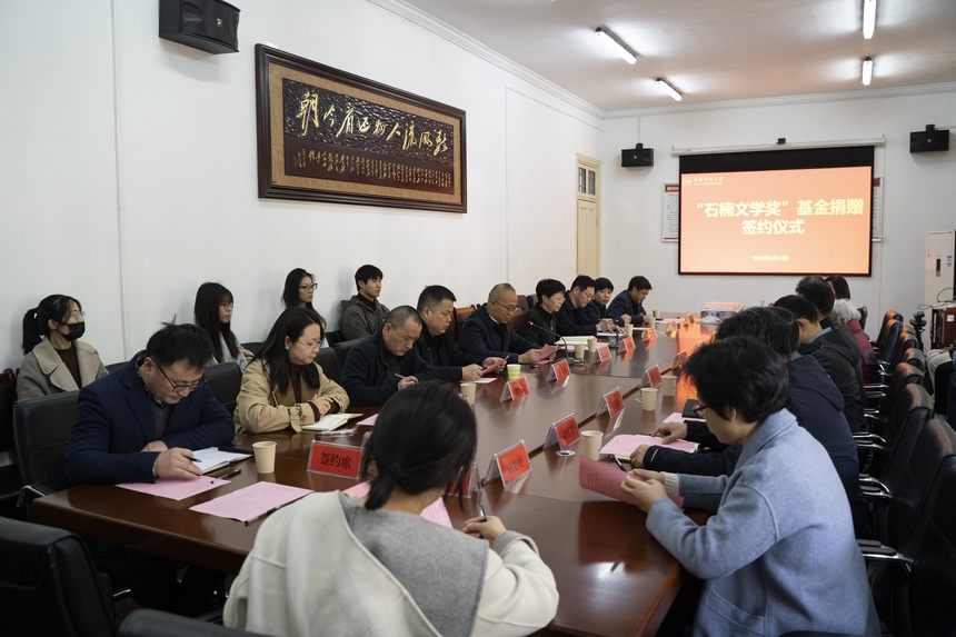 金沙集团3354cc校长彭凤莲、副校长肖新等领导参加了捐赠仪式,对石楠长期以来情系学校建设、系学生发展表示衷心感谢。彭凤莲表示,学校将加强管理,专款专用,发挥人文学科优势,努力培养更多优秀的青年文学人才,助力当代文学繁荣发展。